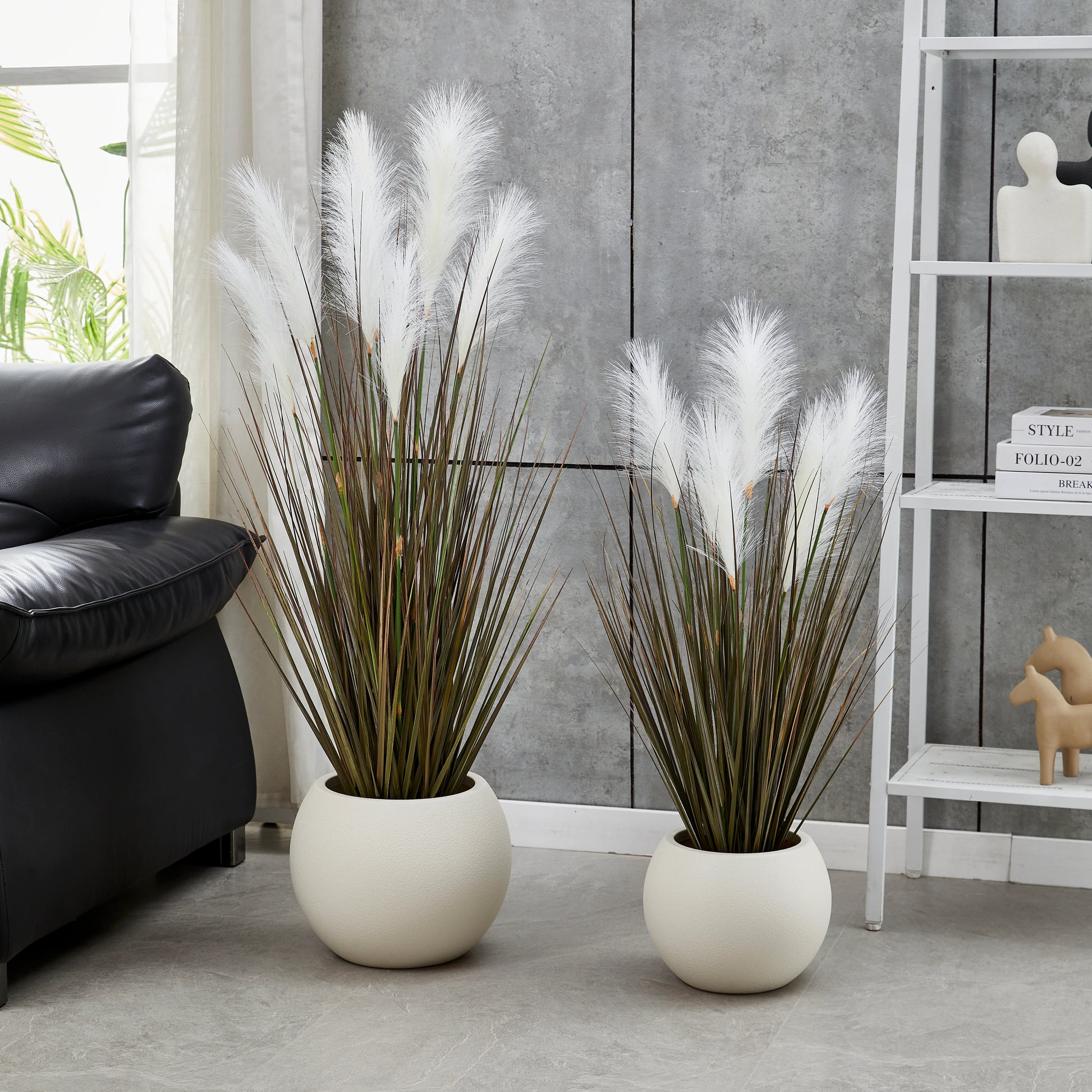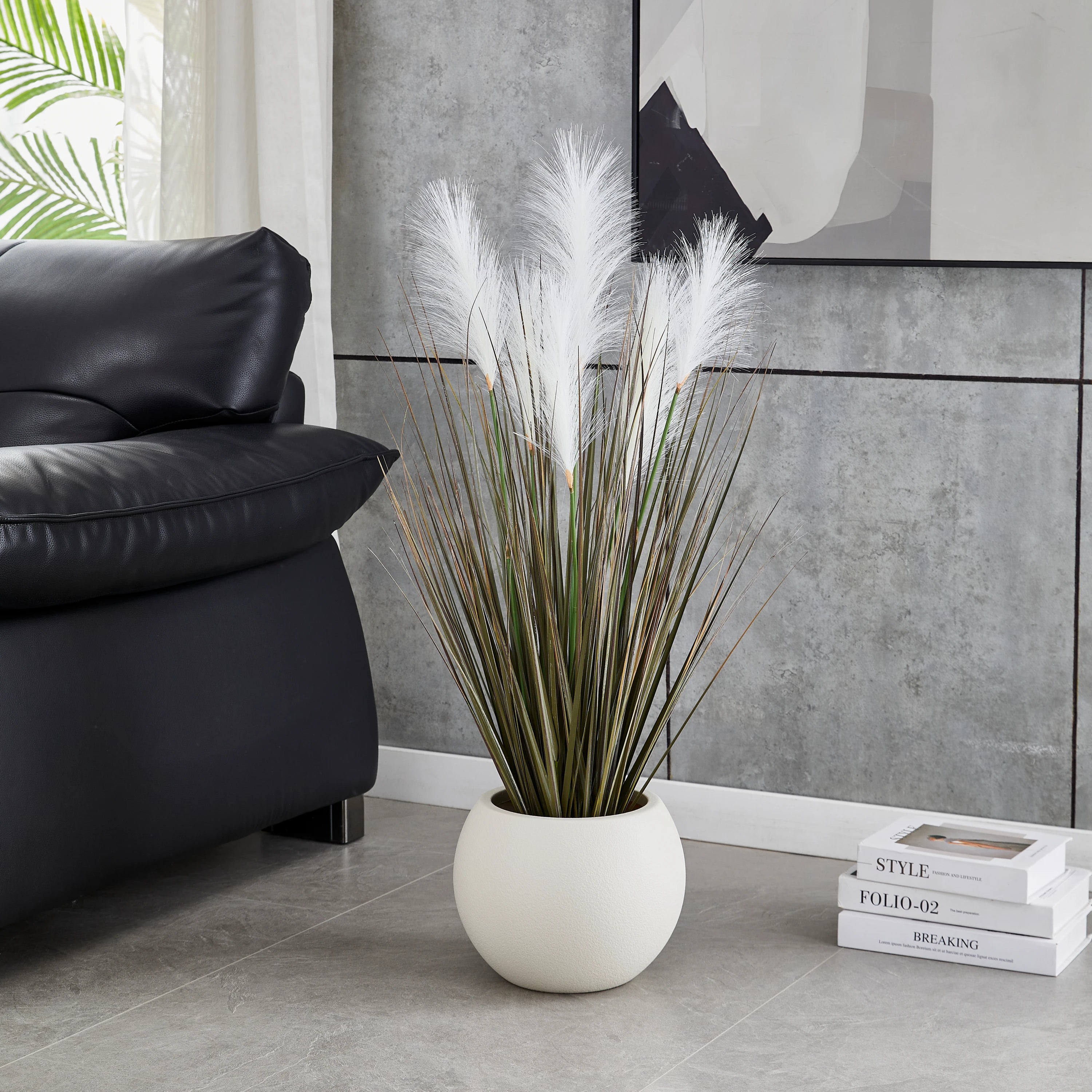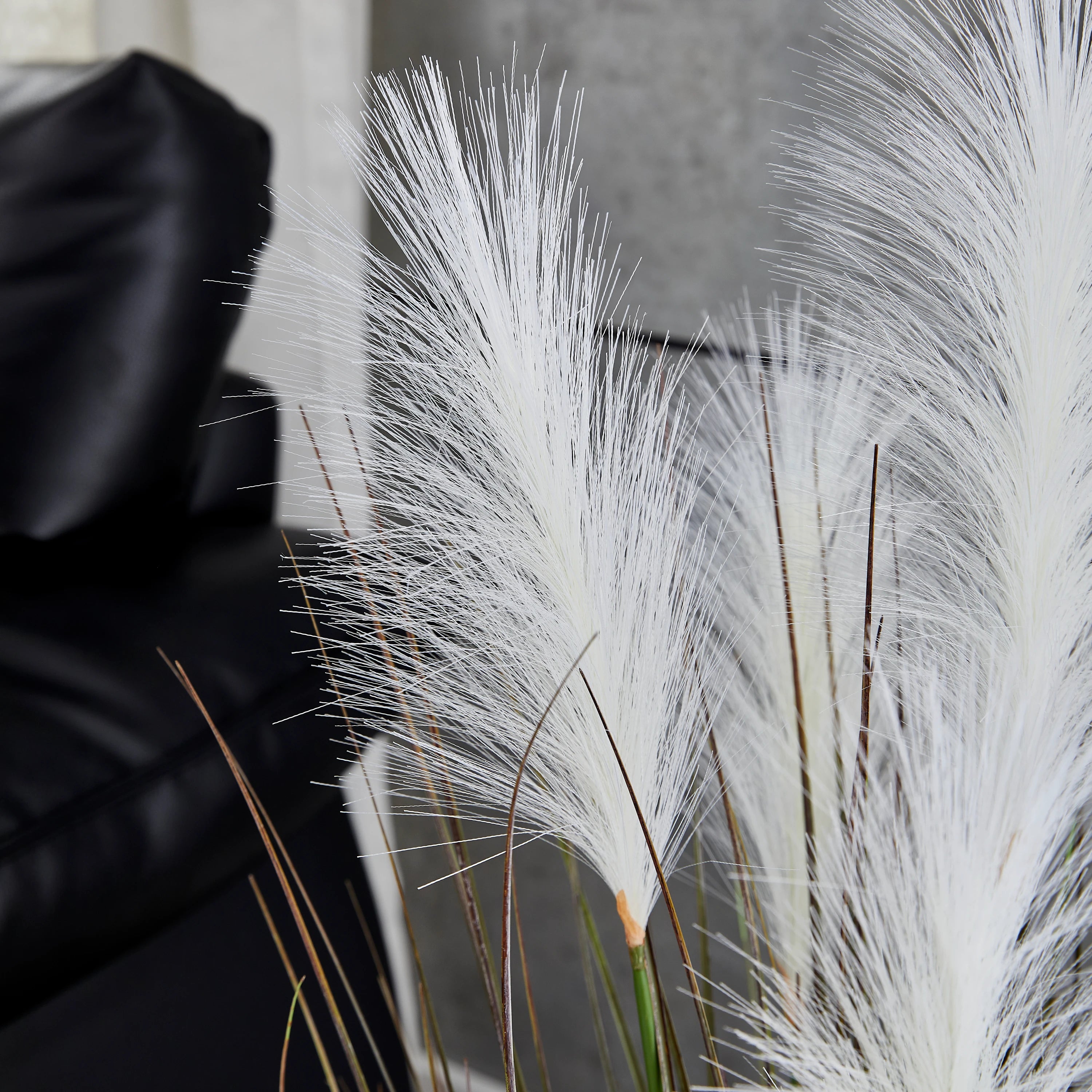 Eudora besticht durch seine naturgetreue Nachbildung und die Liebe zum Detail. Besonders hervorzuheben ist der integrierte Fruchtstamm, der dem Gras eine authentische Tiefe und Struktur verleiht. Im Gegensatz zu echtem Pampasgras behält Eudora stets seine Form, fusselt nicht und benötigt kein Licht oder Wasser. Die feinen Halme wirken filigran und bewegen sich optisch leicht, was eine beruhigende Wirkung auf die gesamte Raumdynamik hat.